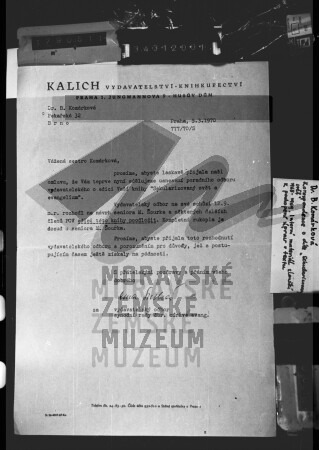 Dopis z vydavatelství Českobratrské církve evangelické Kalich adresovaný Boženě Komárkové, korespondence o jejím díle Sekularizovaný svět a evangelium, březen 1970.