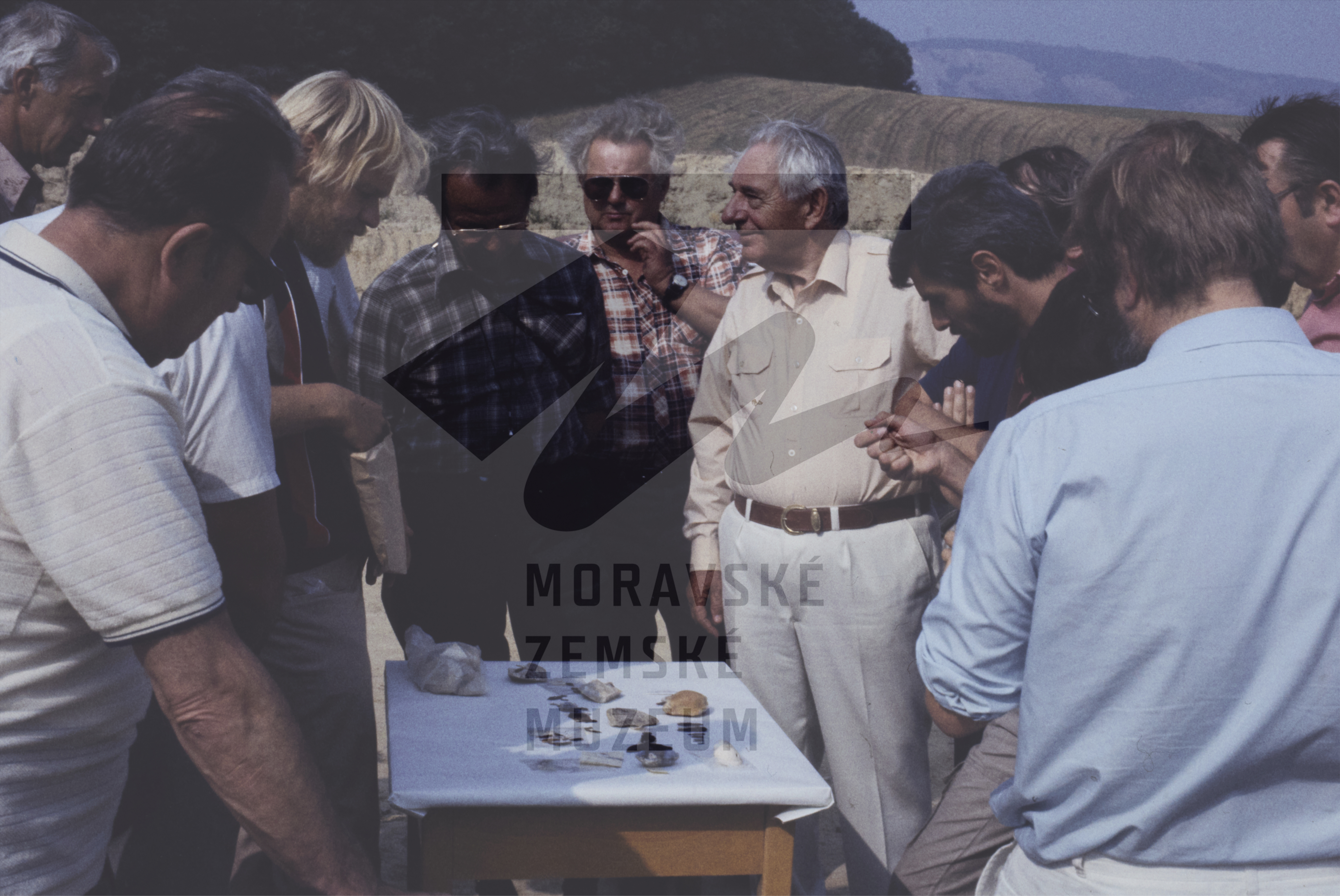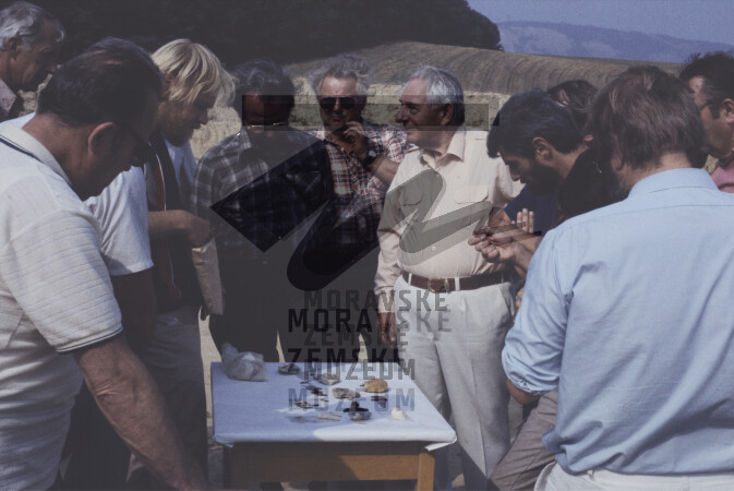 Odborná komise, prohlídka nálezů. Zleva Ondruš, V. Gebauer (s brýlemi), M. Oliva, K. Valoch (s brýlemi v tmavé košili), J. Poulík (světlá košile), J. Svoboda (tmavý plnovous).