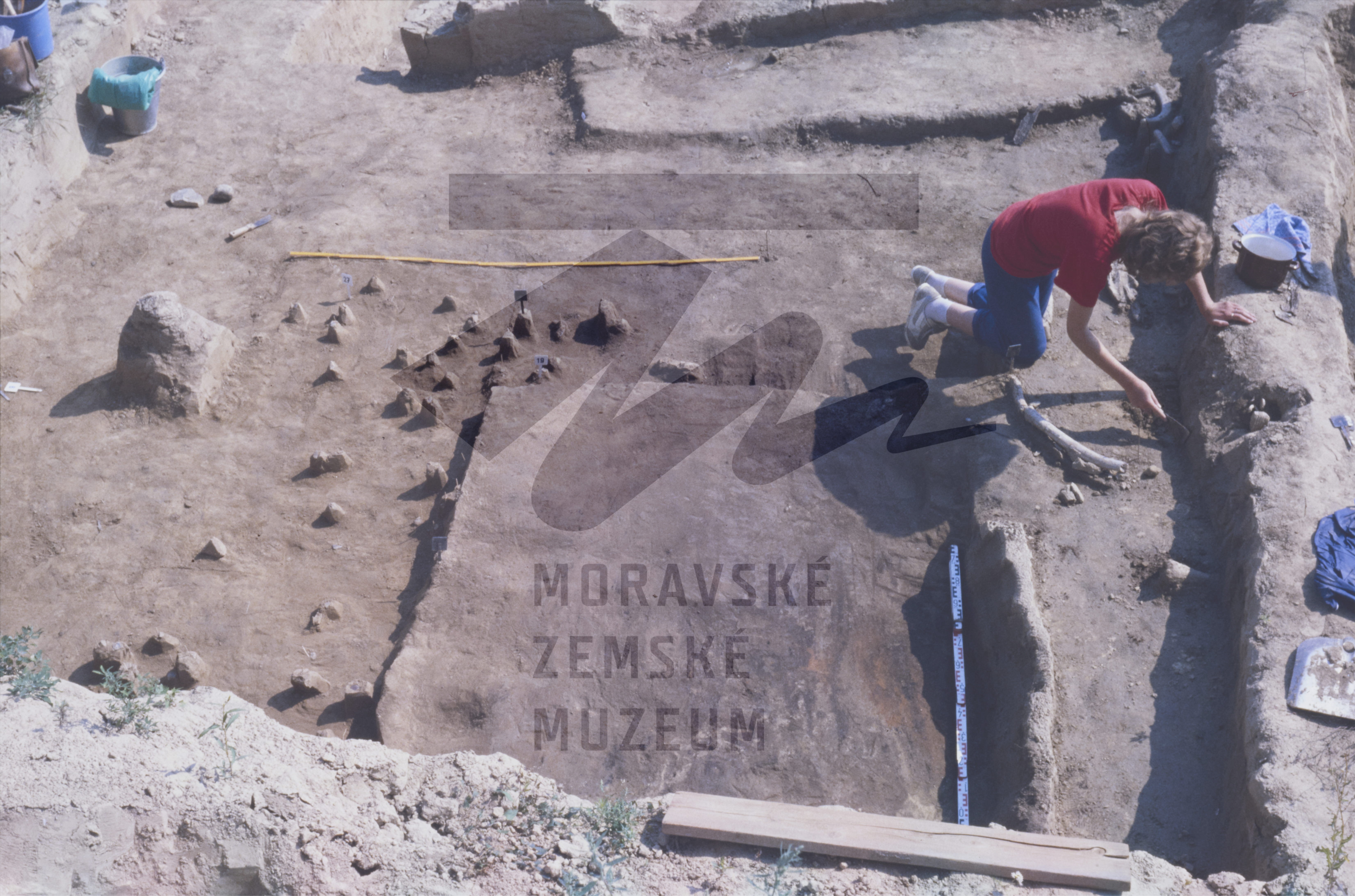 Preparace aurignacienské kulturní vrstvy s ohništi.